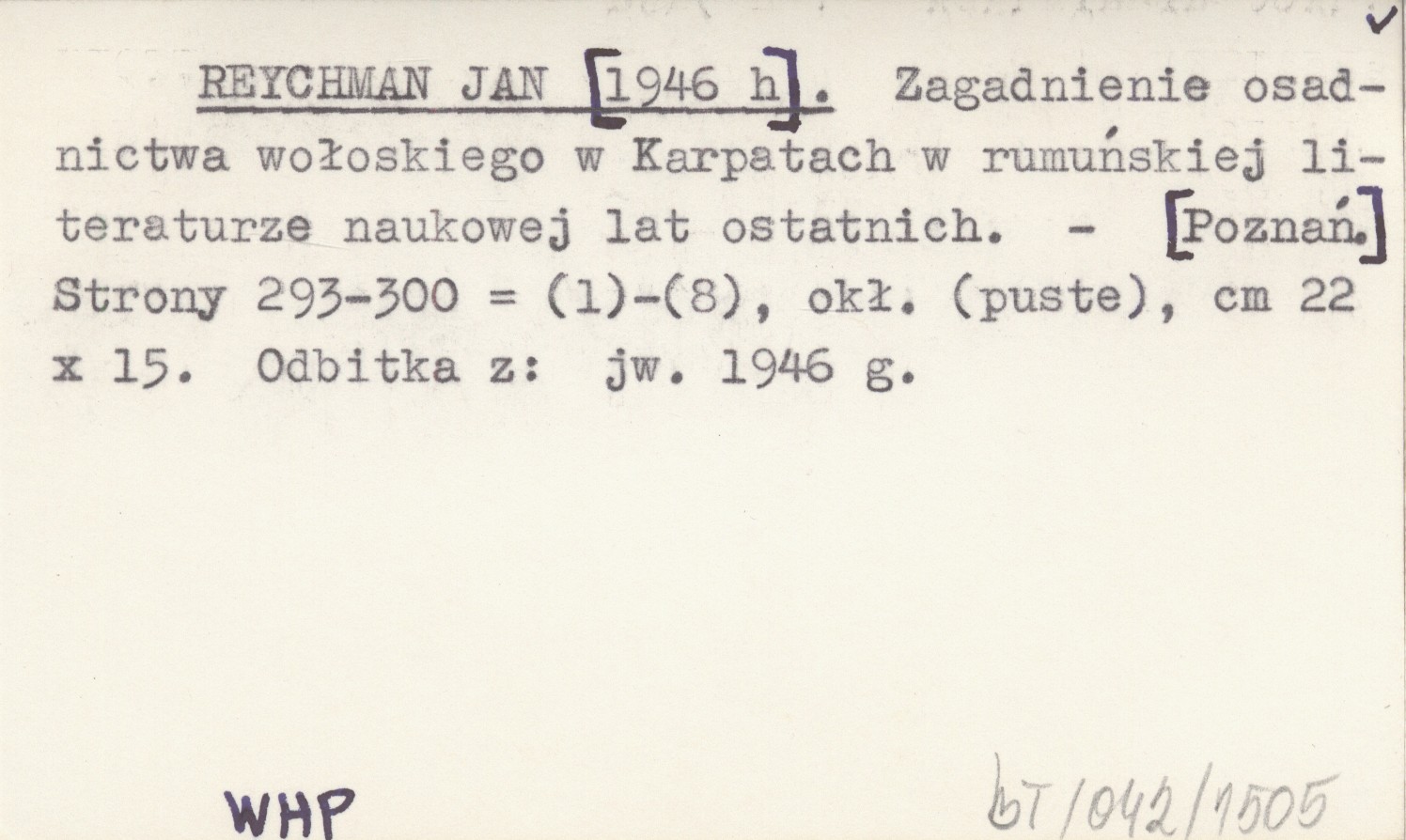 REYCHMAN Jan [1946 h] Zagadnienie osadnictwa wołoskiego w Karpatach w rumuńskiej literaturze naukowej lat ostatnich.