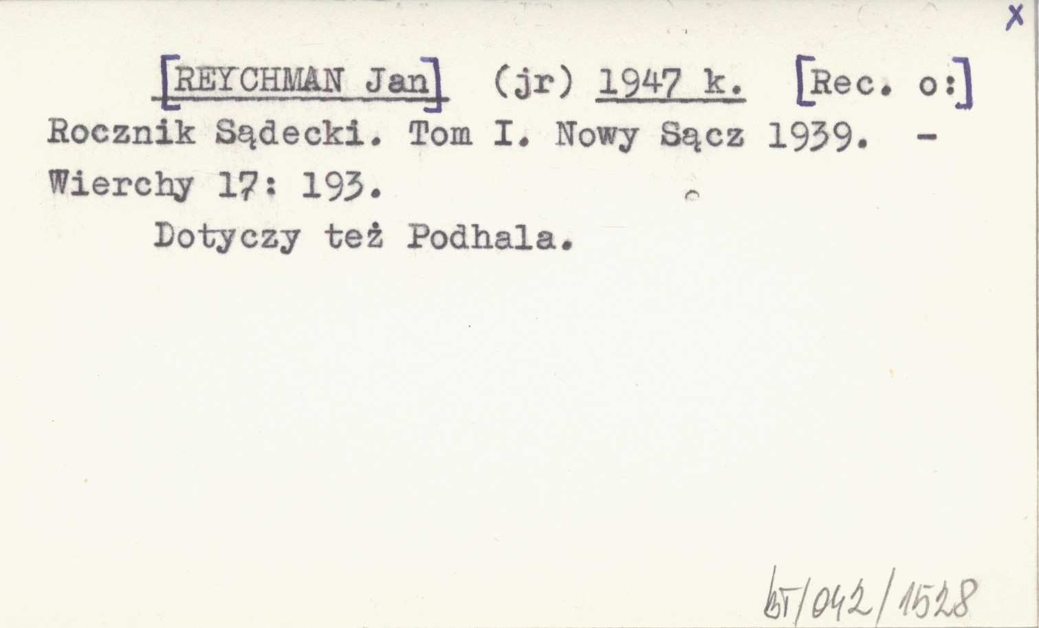 (jr) [REYCHMAN Jan] 1947 k Rocznik Sądecki. Tom I. Nowy Sącz 1939.