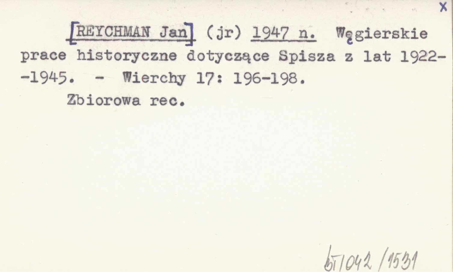 (jr) [REYCHMAN Jan] 1947 n Węgierskie prace historyczne dotyczące Spisza z lat 1922-1945.