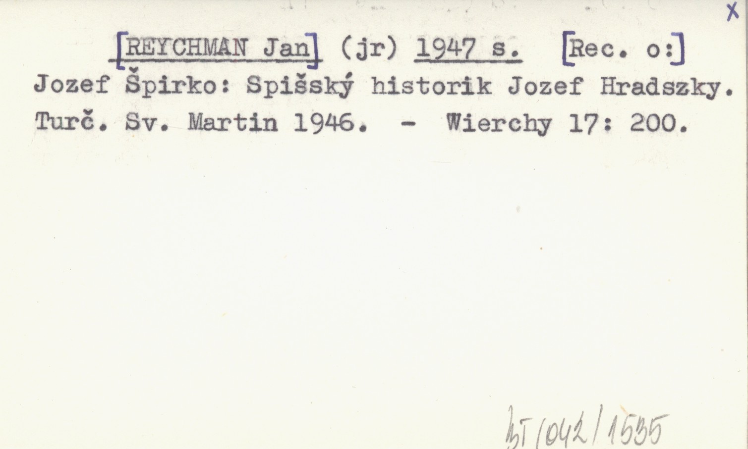 (jr) [REYCHMAN Jan] 1947 s Jozef Špirko: Spišský historik Jozef Hradszky. Turč. Sv. Martin 1946.