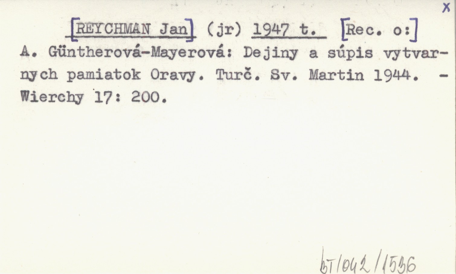 (jr) [REYCHMAN Jan] 1947 t A. Güntherová-Mayerová: Dejiny a súpis vytvarnych pamiatok Oravy. Turč. Sv. Martin 1944.