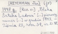 (jr) [REYCHMAN Jan] 1948 g "Polska Sztuka Ludowa" [...] pierwszy numer [...] w grudniu 1947.