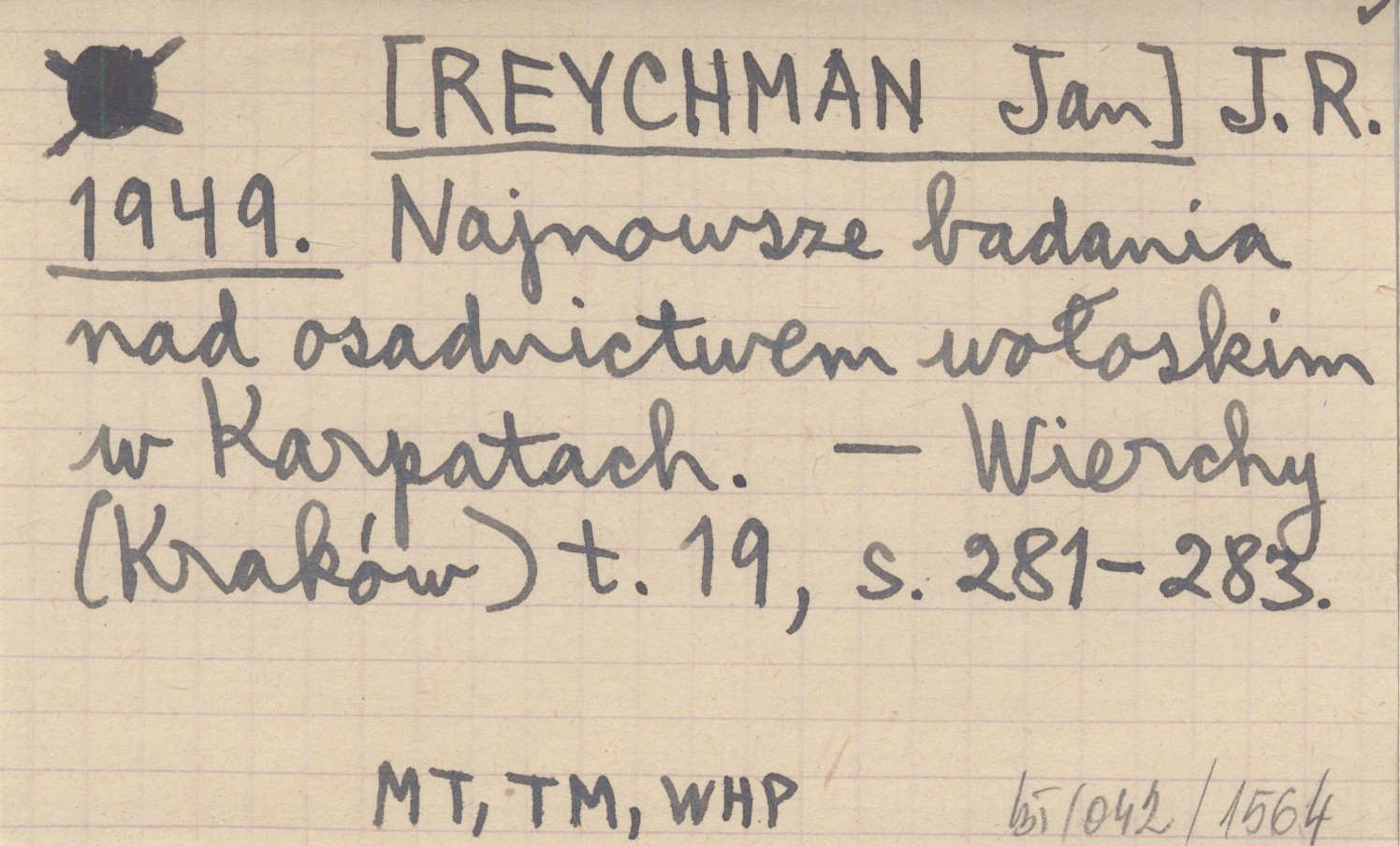 J. R. [REYCHMAN Jan] 1949 Najnowsze badania nad osadnictwem wołoskim w Karpatach.