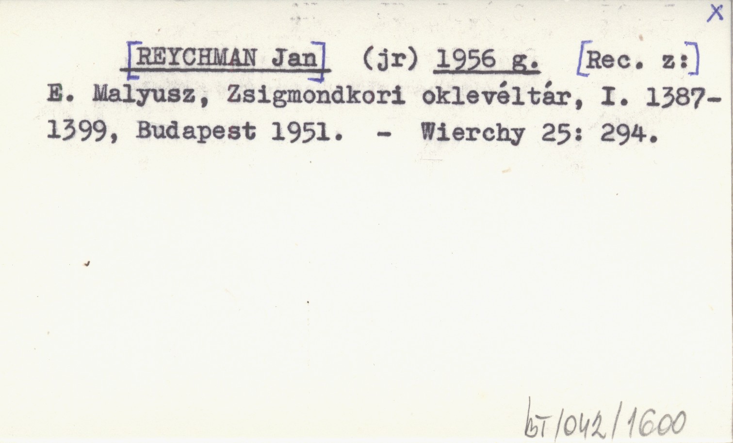 (jr) [REYCHMAN Jan] 1956 g E. Malyusz, Zsigmondkori oklevéltár, I. 1387-1399, Budapest 1951.