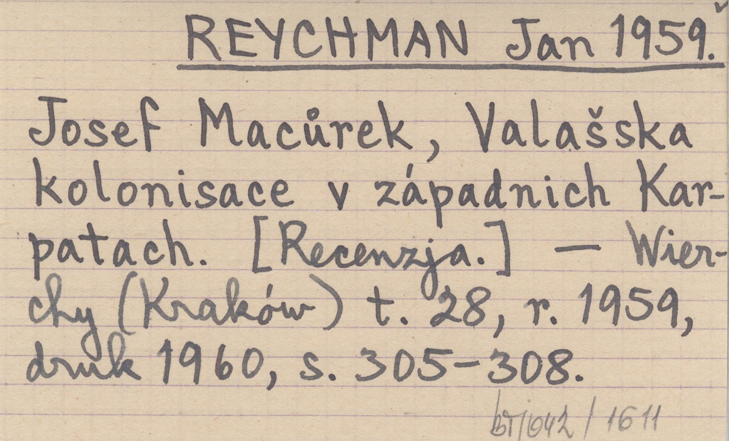 REYCHMAN Jan 1959 Josef Macůrek, Valašska kolonisace v západnich Karpatach. [Recenzja].