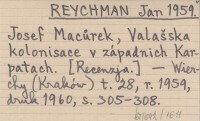 REYCHMAN Jan 1959 Josef Macůrek, Valašska kolonisace v západnich Karpatach. [Recenzja].