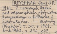 J.R. [REYCHMAN Jan] 1961 Z nowszych badań nad oddźwiękiem zbójnictwa karpackiego w folklorze i literaturze.