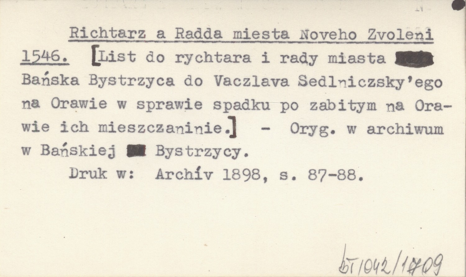 , Oryg. w archiwum w Bańskiej Bystrzycy. Druk w: Archív 1898: 87-88.