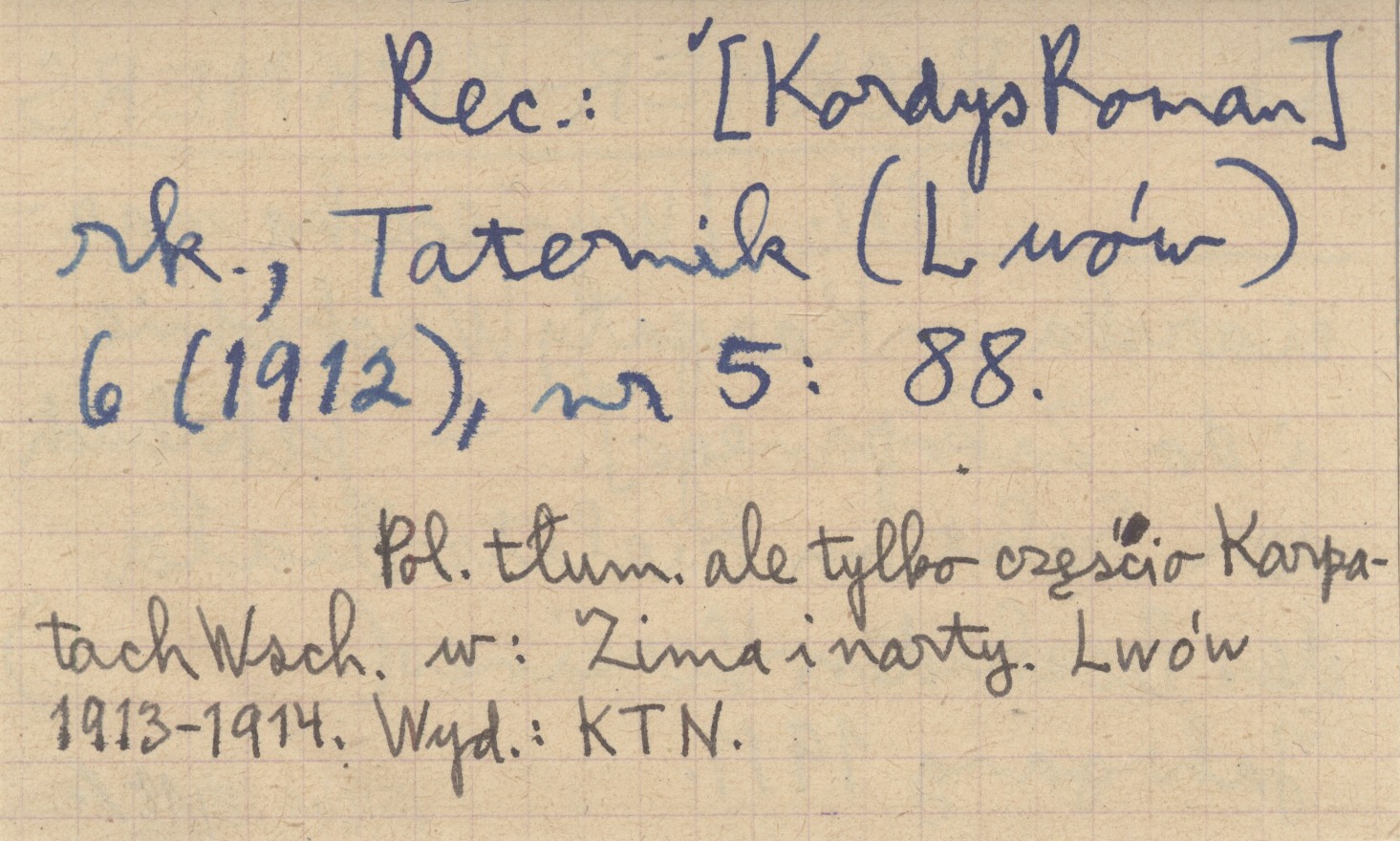 Jahrbuch der Sektion Bielitz-Biala des Beskidenvereines, Jahrgang 1911. Pol. tłum. ale tylko części o Karpatach Wsch. w: Zima i narty. Lwów 1913-1914. Wyd.: KTN. REC: [KORDYS Roman] rk., Taternik (Lwów) 6 (1912), nr 5: 88.