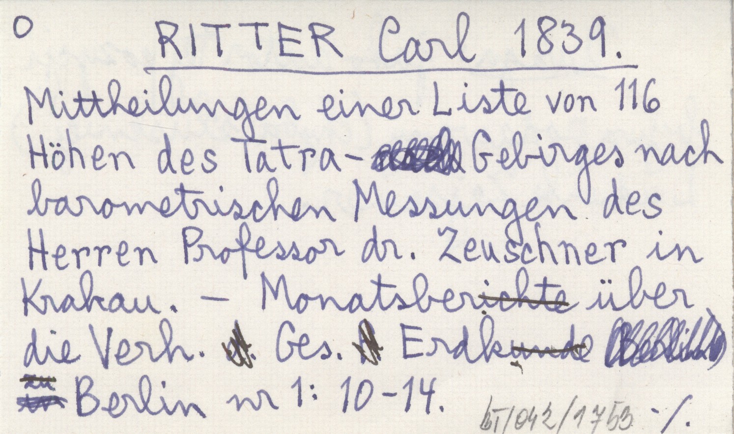 RITTER Carl 1839 Mittheilungen einer Liste von 116 Höhen des Tatra-Gebirges nach barometrischen Messungen des Herren Professor dr. Zeuschner in Krakau.