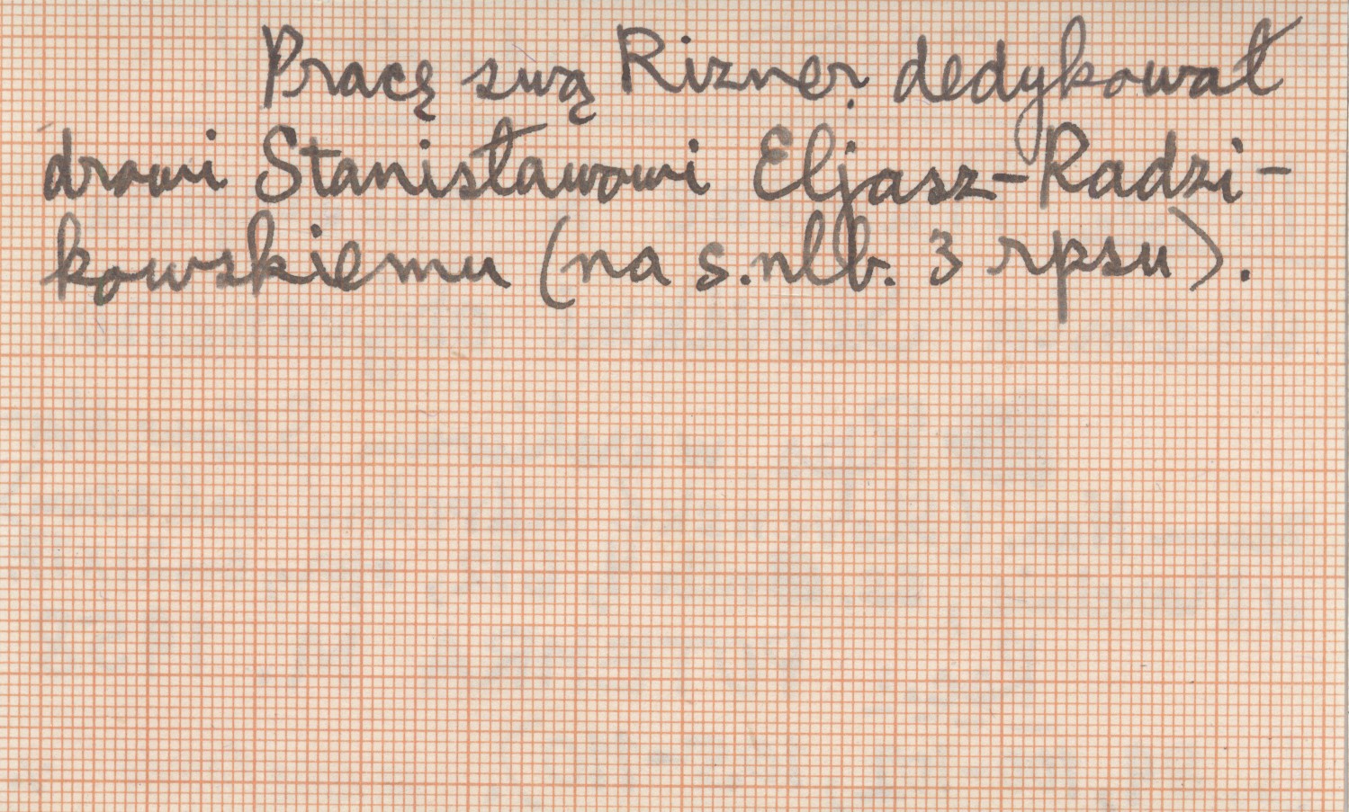 , Pracę swą Rizner dedykował drowi Stanisławowi Eljasz-Radzikowskiemu (na s. [3] rpsu). Rps. w archiwum Słow. Muzeum Nar. (Slovenské národné múzeum) w Marcinie, [4], 612 s., opr., 21x17 cm. REC: POTEMRA M. 1958 (s. 89, 100-101, 105-110).