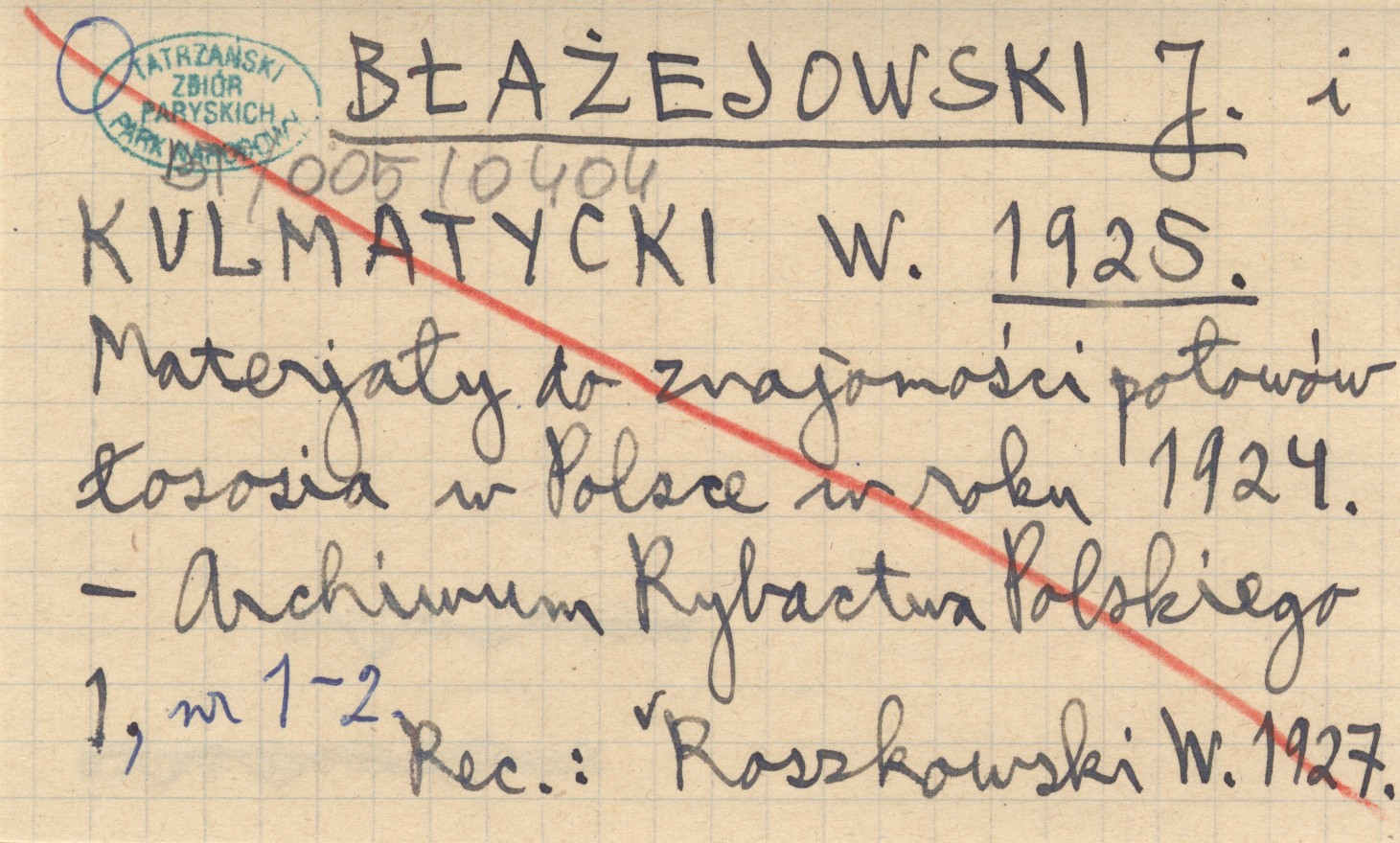 BŁAŻEJOWSKI J. KULMATYCKI, W. ; 1925 Materjały do znajomości połowów łososia w Polsce w roku 1924.