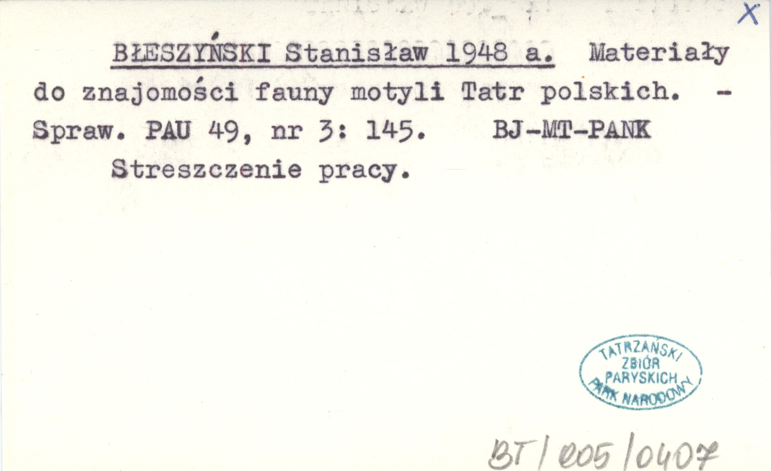 BŁESZYŃSKI Stanisław 1948 a Materiały do znajomości fauny motyli Tatr polskich.