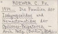 ROEWER C. Fr. 1914... Die Familien der Ischropsalidae und Nemastomatidae der Opiliones-Palpatores.