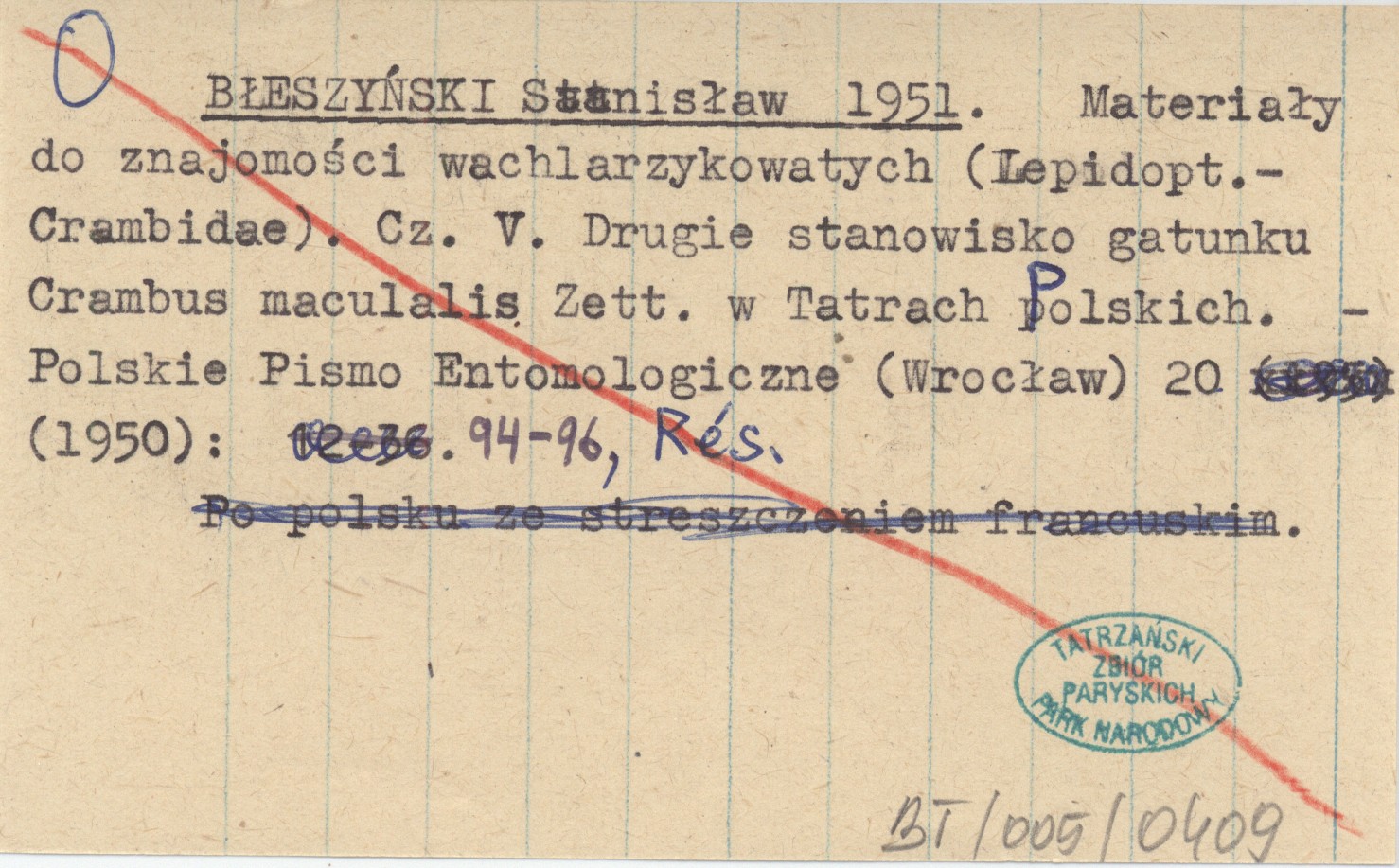 BŁESZYŃSKI Stanisław 1951 Materiały do znajomości wachlarzykowatych (Lepidopt.-Crambidae). Cz. V. Drugie stanowisko gatunku Crambus maculalis Zett. w Tatrach Polskich.