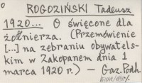 ROGOZIŃSKI Tadeusz 1920... O święcone dla żołnierza. (Przemówienie [...] na zebraniu obywatelskim w Zakopanem dnia 1 marca 1920 r.).