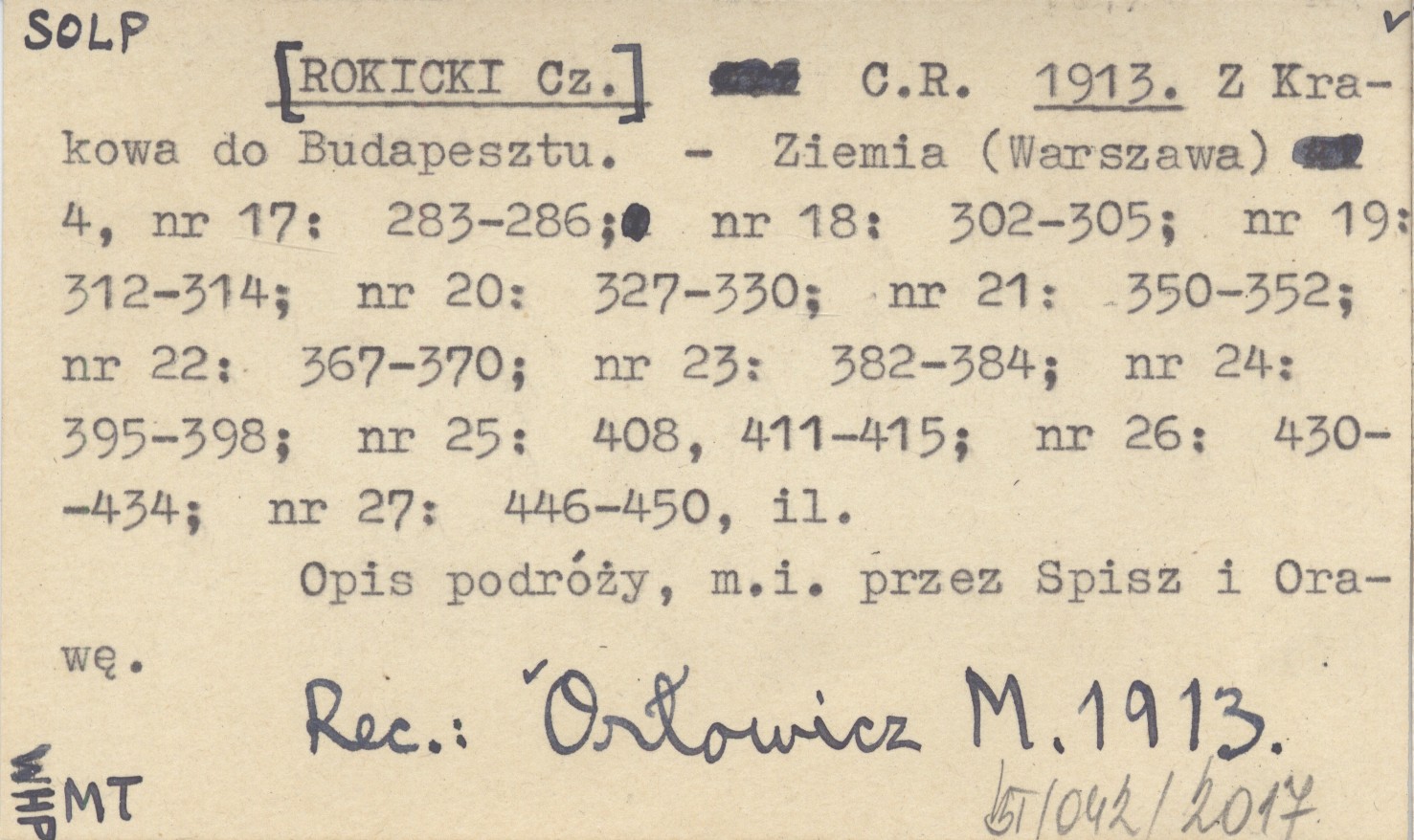 Ziemia (Warszawa) , 4, nr 17: 283-286 ; nr 18: 302-305 ; nr 19: 312-314 ; nr 20: 327-330 ; nr 21: 350-352 ; nr 22: 367-370 ; nr 23: 382-384 ; nr 24: 395-398 ; nr 25: 408, 411-415 ; nr 26: 430-434 ; nr 27: 446-450, il. Opis podróży, m.i. przez Spisz i Orawę. REC: ORŁOWICZ M. 1913