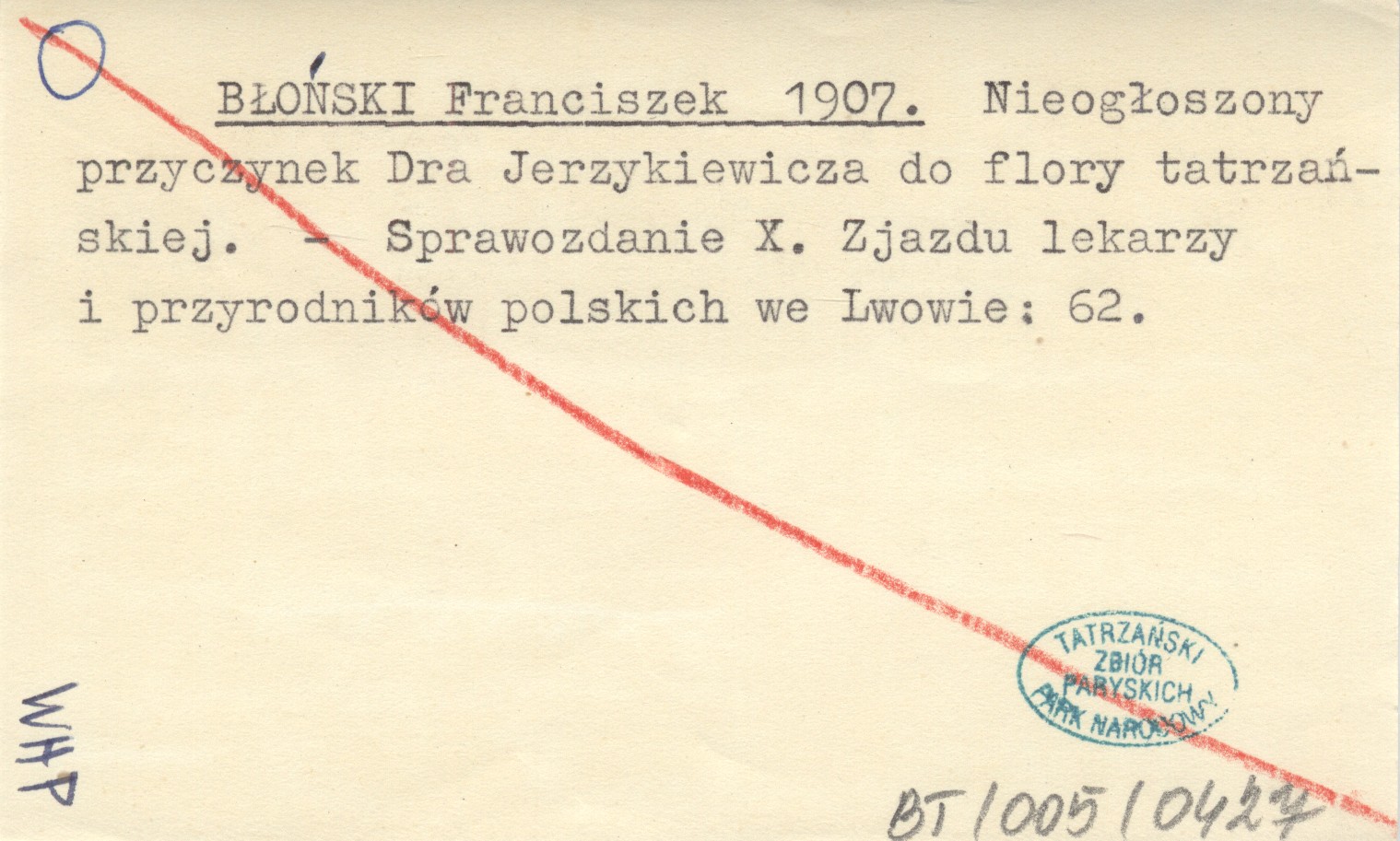 BŁOŃSKI Franciszek 1907 Nieogłoszony przyczynek Dra Jerzykiewicza do flory tatrzańskiej.