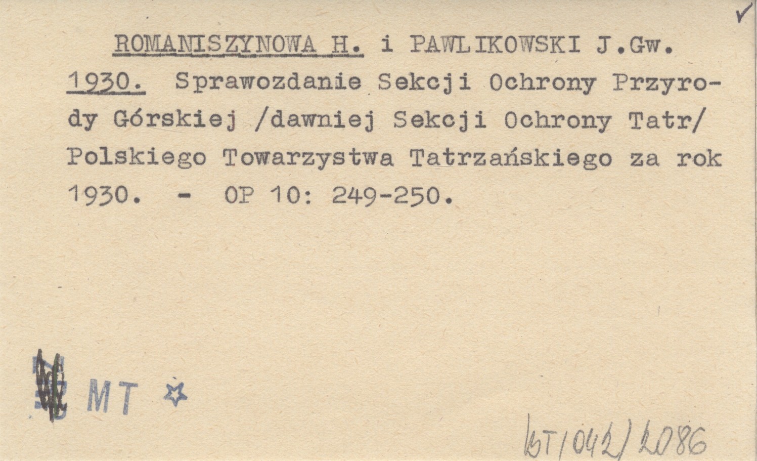 ROMANISZYNOWA H. PAWLIKOWSKI, J.Gw. ; 1930 Sprawozdanie Sekcji Ochrony Przyrody Górskiej (dawnej Sekcji Ochrony Tatr) Polskiego Towarzystwa Tatrzańskiego za rok 1930.