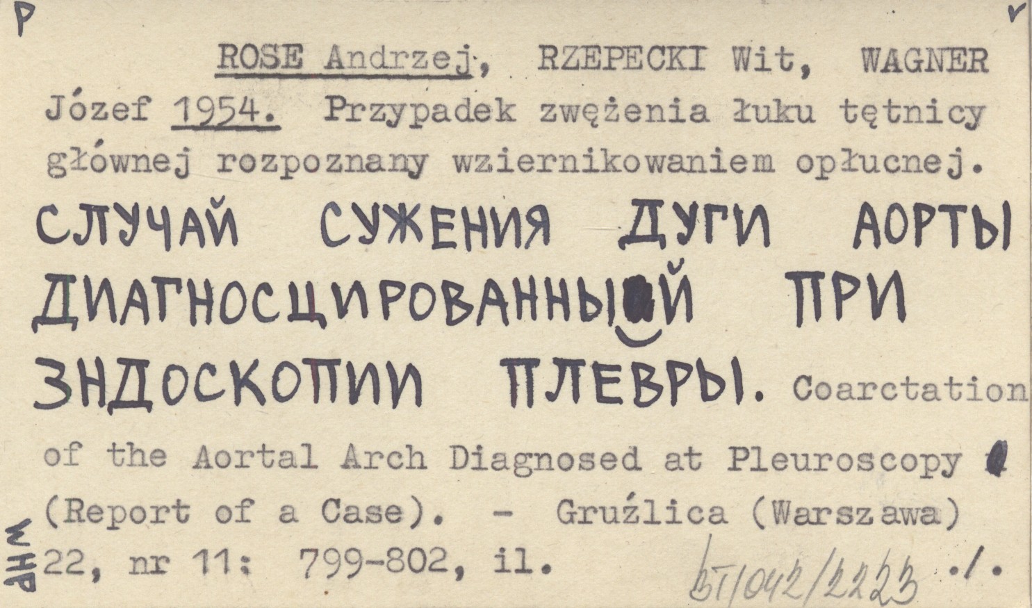 ROSE Andrzej RZEPECKI, Wit. ; WAGNER, Józef. ; 1954 Przypadek zwężenia łuku tętnicy głównej rozpoznany wziernikowaniem opłucnej. Slučaj suženija dugi aorty diagnoscirovannyj pri zndoskopii plevry. Coarctation of the Aortal Arch Diagnosed at Pleuroscopy (Report of a Case).