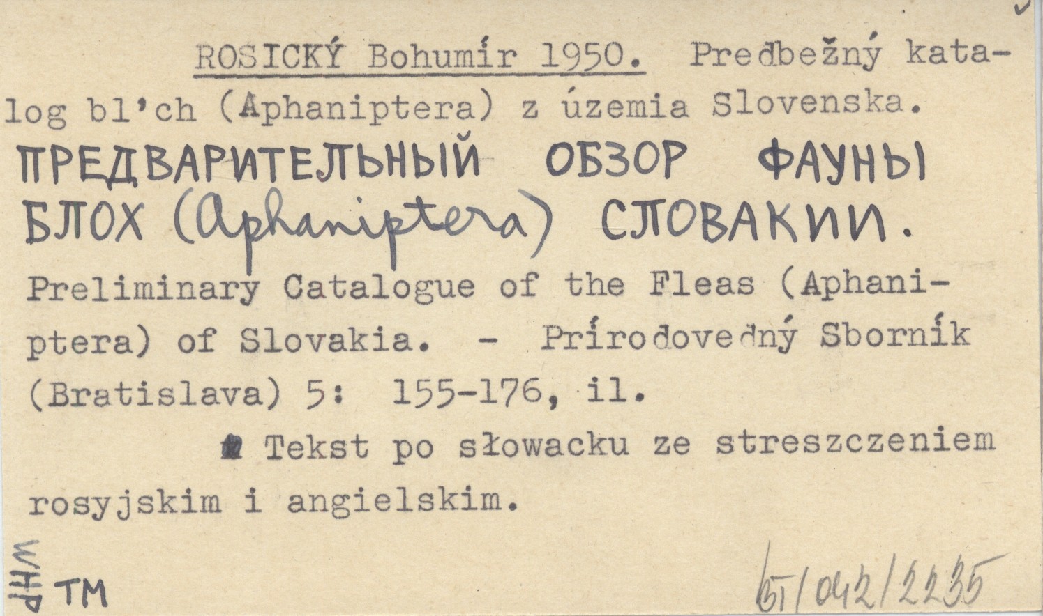 ROSICKĘ Bohumír 1950 PredbeŸnę katalog b”ch (Aphaniptera) z územia Slovenska. Predvaritel'nyj obzor fauny bloch (Aphaniptera) Slovakii. Preliminary Catalogue of the Fleas (Aphaniptera) of Slovakia.