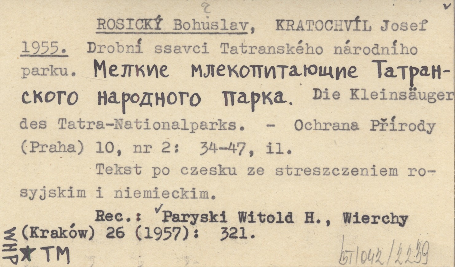 ROSICKÝ Bohuslav KRATOCHVÍL, Josef. ; 1955 Drobní ssavci Tatranského národního parku. Melkie mlekopitajušie Tatranskogo narodnogo parka. Die Kleinsäuger des Tatra-Nationalparks.