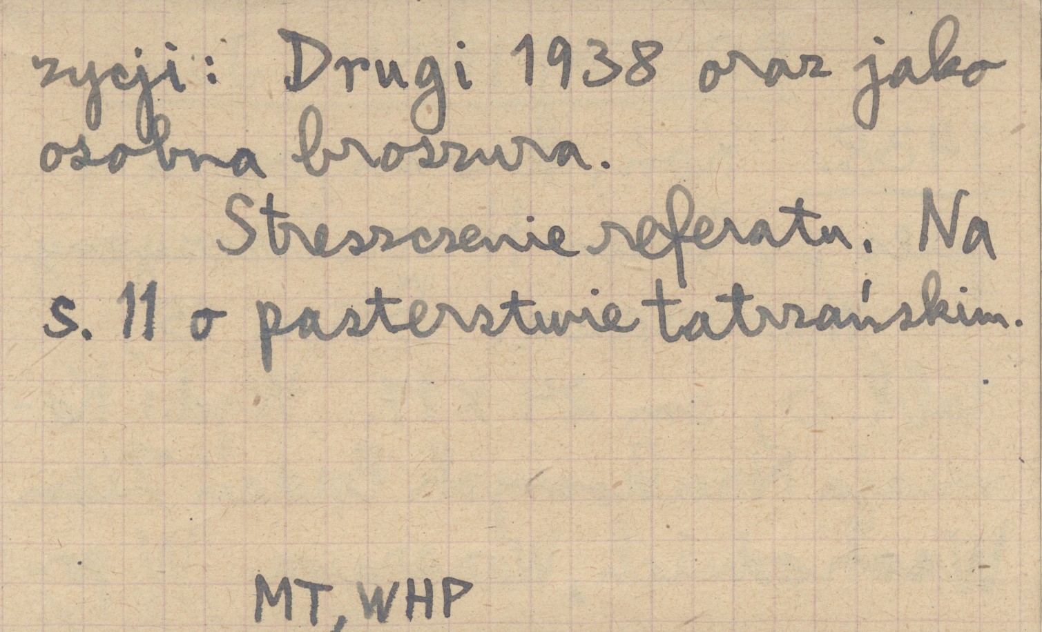 Drugi 1938. Komisja Naukowych Badań Ziem Wschodnich, Warszawa , 15 s., 3 k. tabl., 24x17 cm. Streszczenie referatu. Na s. 11 o pasterstwie tatrzańskim. W pozycji: Drugi 1938 oraz jako osobna broszura.