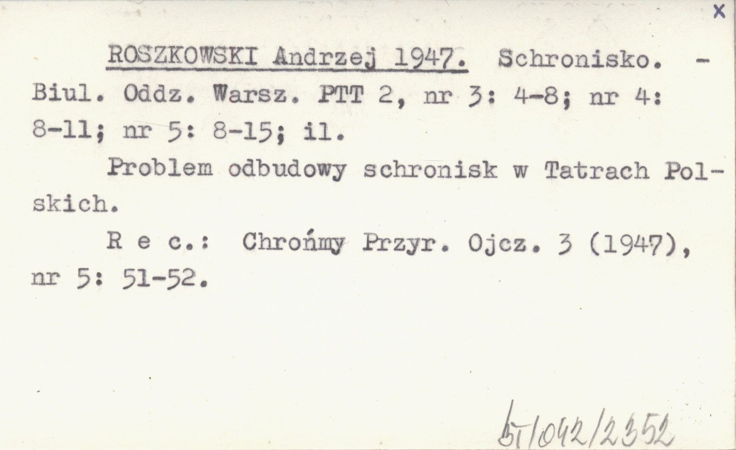 Biuletyn Oddziału Warszawskiego PTT, 2, nr 3: 4-8 ; nr 4: 8-11 ; nr 5: 8-15 ; il. Problem odbudowy schronisk w Tatrach Polskich. REC: Chrońmy Przyrodę Ojczystą 3 (1947), nr 5: 51-52.