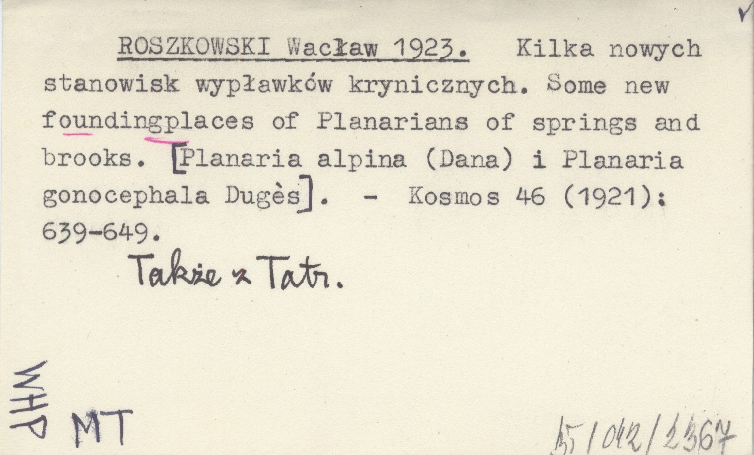 ROSZKOWSKI Wacław 1923 Kilka nowych stanowisk wypławków krynicznych. Some new foundingplaces of Planarians of springs and brooks. [Planaria alpina (Dana) i Planaria gonocephala Dugés].
