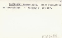 ROSZKOWSKI Wacław 1929 Prace faunistyczne tatrzańskie.
