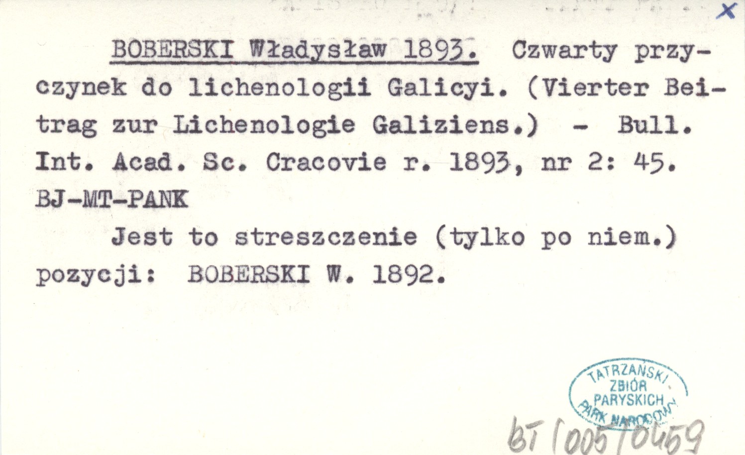 BOBERSKI Władysław 1893 Czwarty przyczynek do lichenologii Galicyi. (Vierter Beitrag zur Lichenologie Galiziens.).