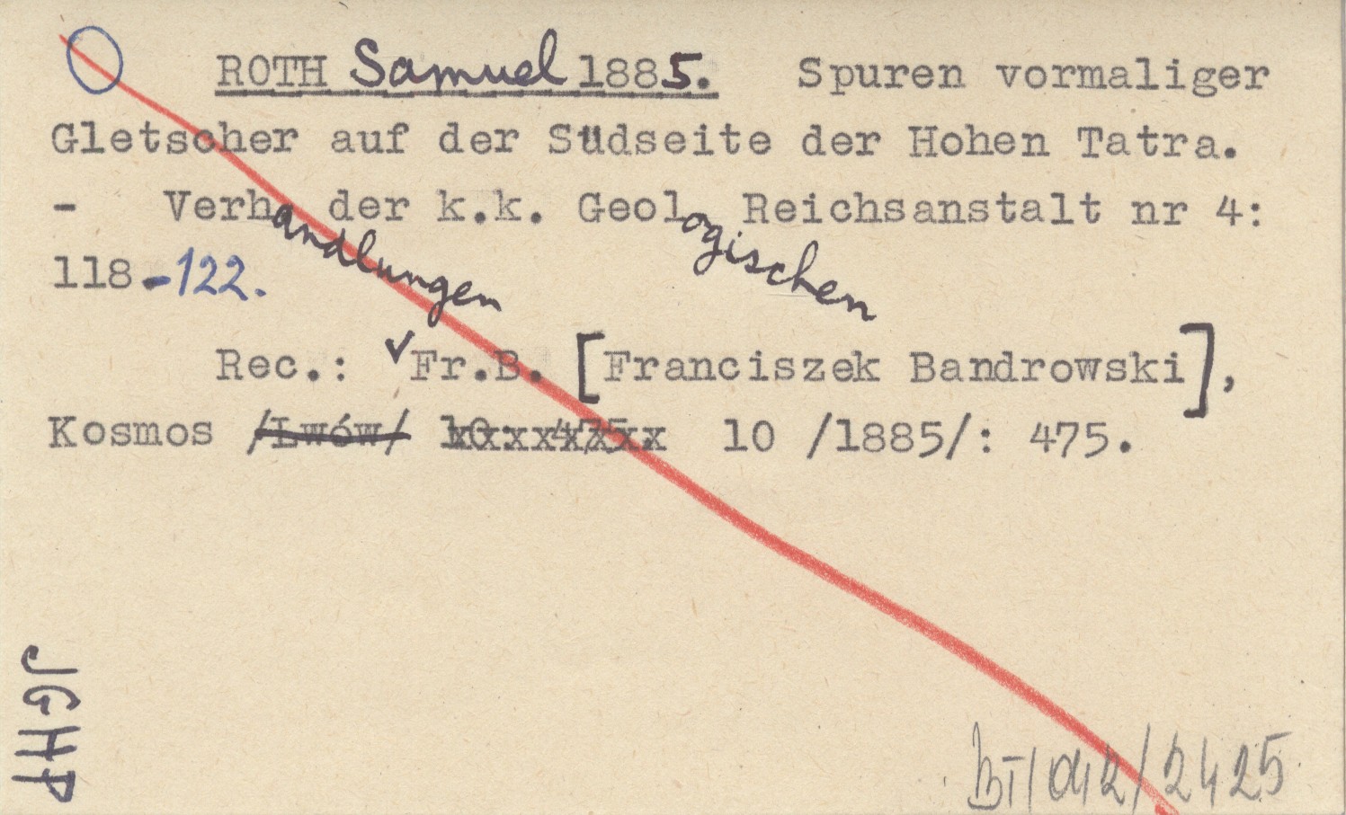 Verhandlungen der kaiserlich-königlichen Geologischen Reichsanstalt, Nr 4: 118-122. REC: Fr.B. [Franciszek BANDROWSKI], Kosmos 10 (1885): 475.