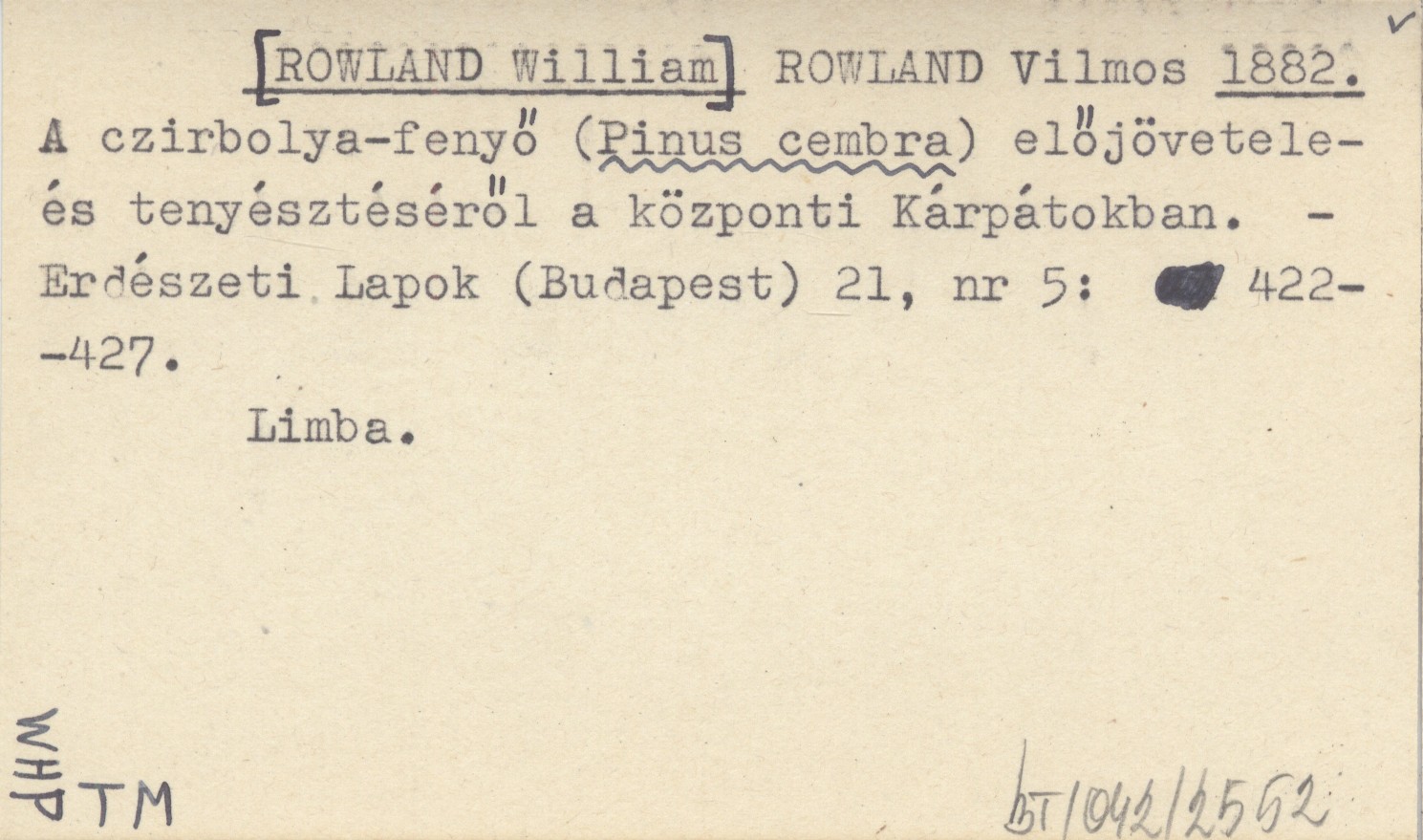 ROWLAND Vilmos [ROWLAND William] 1882 A czirbolya-fenyő (Pinus cembra) előjöveteleés tenyésztéséről a központi Kárpátokban.