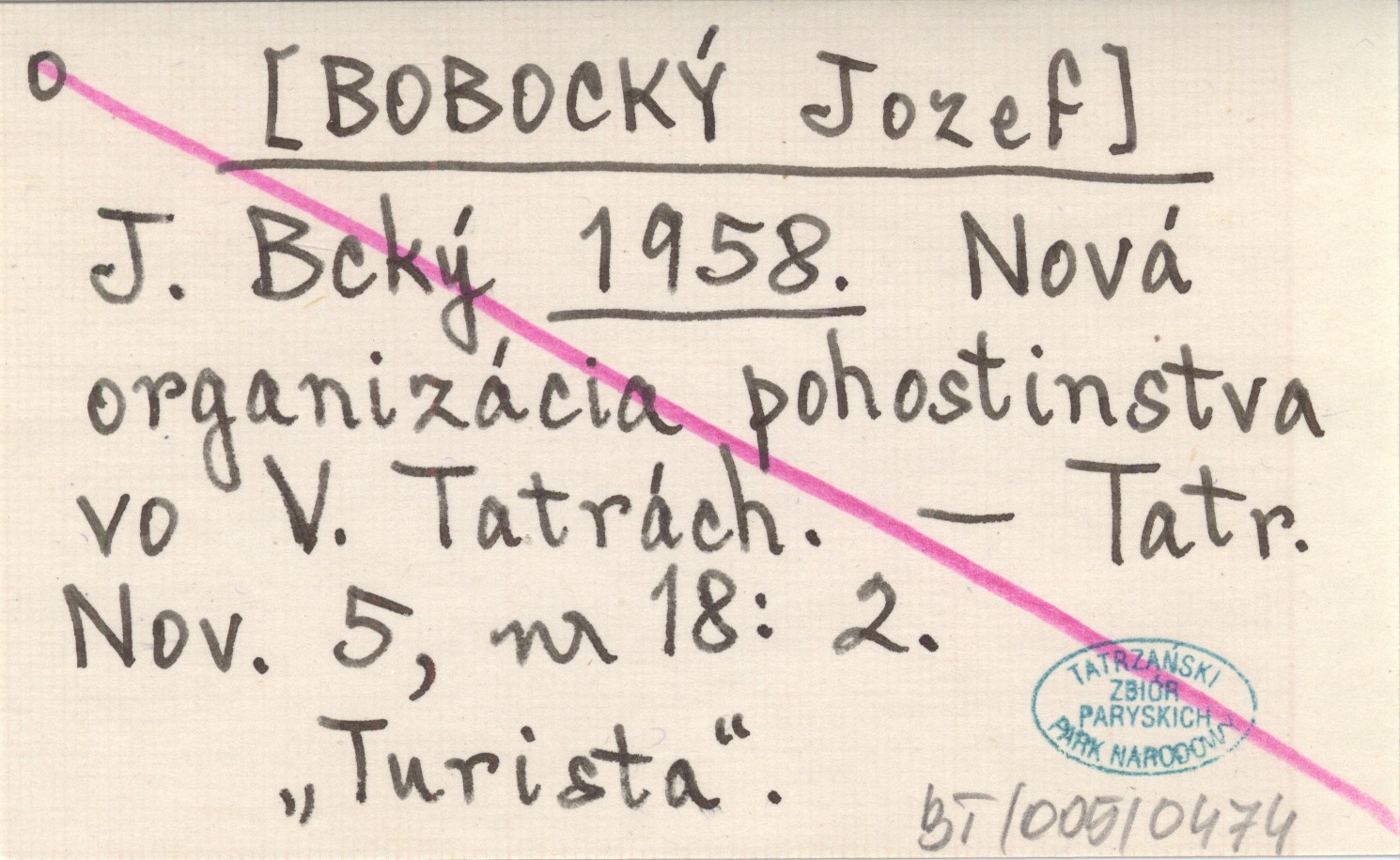 J. Bcký [BOBOCKÝ Jozef] 1958 Nová organizácia pohostinstva vo V. Tatrách.