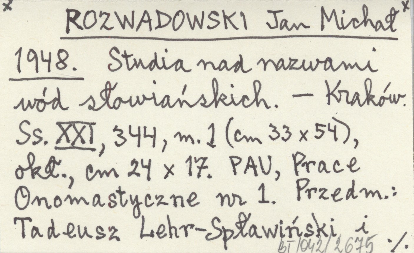 Kraków (PAU, Prace Onomastyczne, nr 1) , XXI s., 344, 1 m. (33x54 cm), okł., 24x17 cm. Przedm.: Tadeusz Lehr-Spławiński i Jan Safarewicz (s. III-VII). REC: SAFAREWICZ J. 1949
