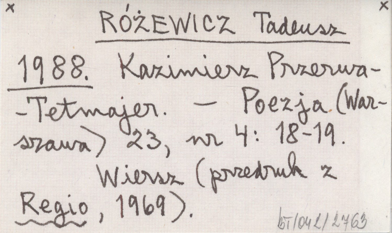 Poezja (Warszawa) , 23, nr 4: 18-19. Wiersz (przedruk z Regio, 1969).