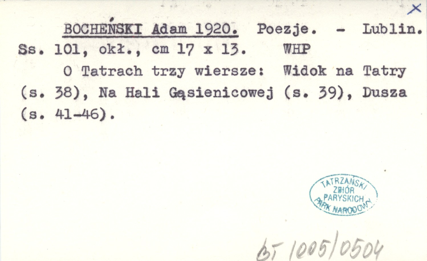 Lublin , 101 s., okł., 17x13 cm. O Tatrach trzy wiersze: Widok na Tatry (s. 38), Na Hali Gąsienicowej (s. 39), Dusza (s. 41-46).