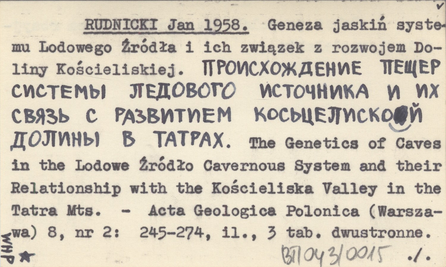 RUDNICKI Jan 1958 Geneza jaskiń systemu Lodowego Źródła i ich związek z rozwojem Doliny Kościeliskiej. Proischoždenie pešer sistemy ledovogo istočinka i ich svjaz' s razvitiem Kos'čeliskoj Doliny v Tatrach. The Genetics of Caves in the Lodowe Źródło Cavernous System and their Relationship with the Kościeliska Valley in the Tatra Mts.