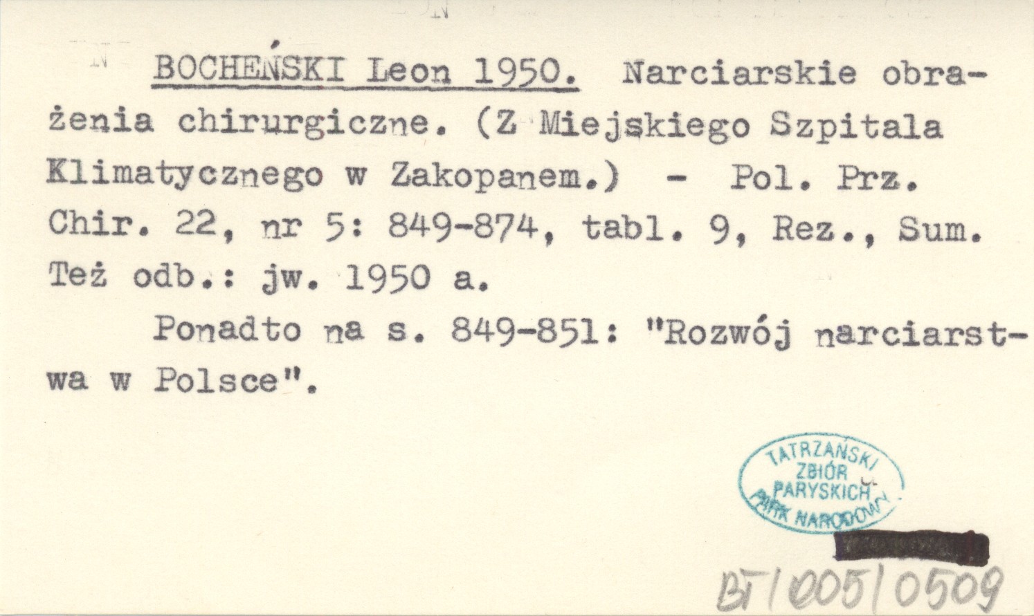 Polski Przegląd Chirurgiczny, 22, nr 5: 849-874, 9 k. tabl., Rez., Sum. Ponadto na s. 849-851: "Rozwój narciarstwa w Polsce". Też odb.: jw. 1950 a
