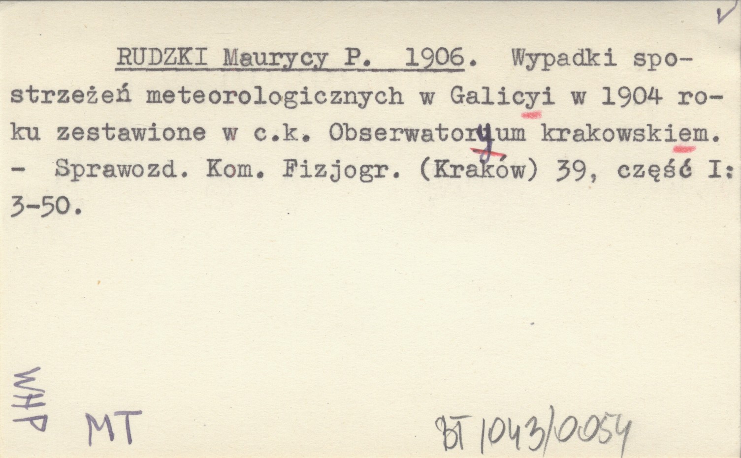 RUDZKI Maurycy P. 1906 Wypadki spostrzeżeń meteorologicznych w Galicyi w 1904 roku zestawione w c.k. Obserwatoryum krakowskiem.