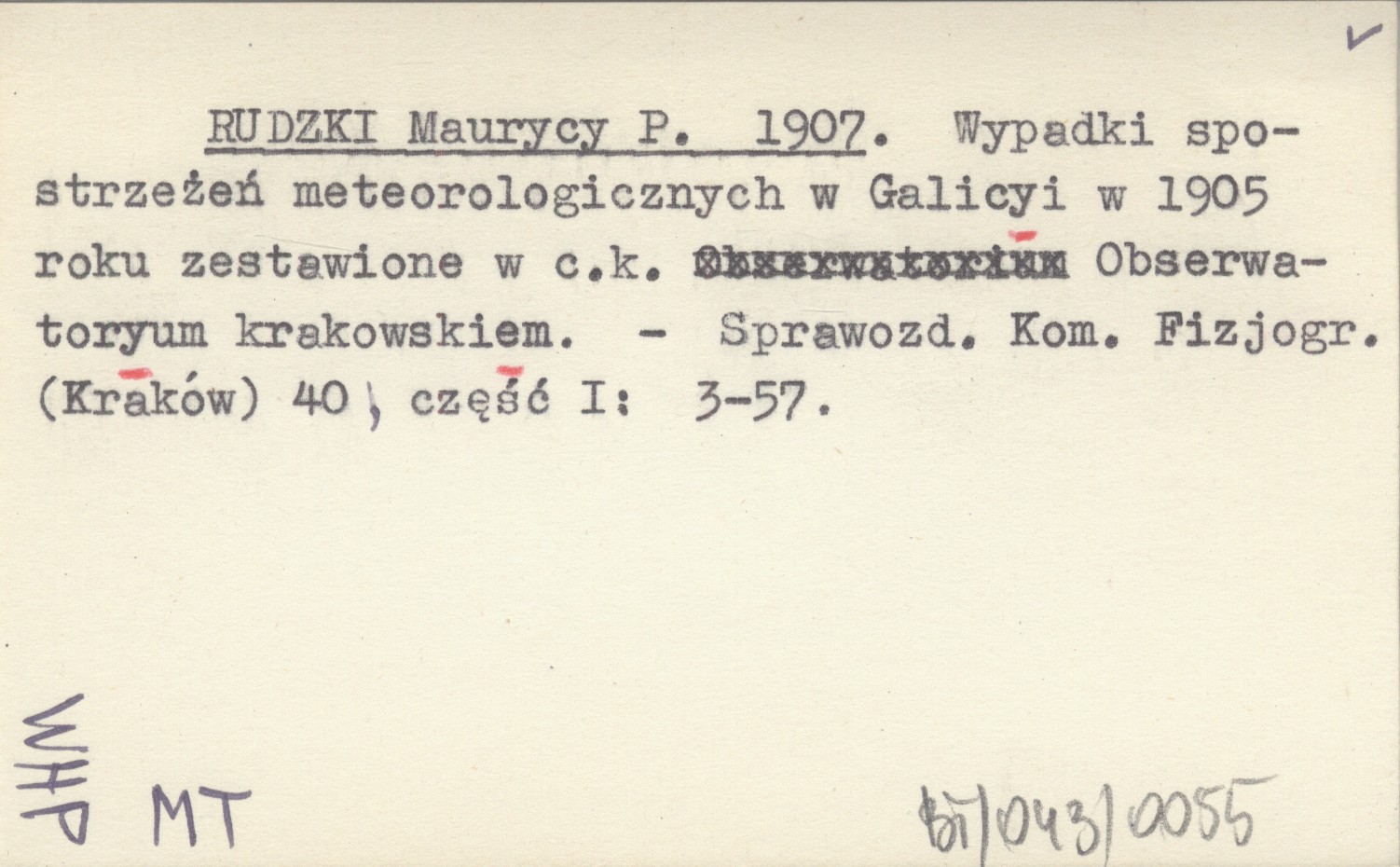 RUDZKI Maurycy P. 1907 Wypadki spostrzeżeń meteorologicznych w Galicyi w 1905 roku zestawione w c.k. Obserwatoryum krakowskiem.