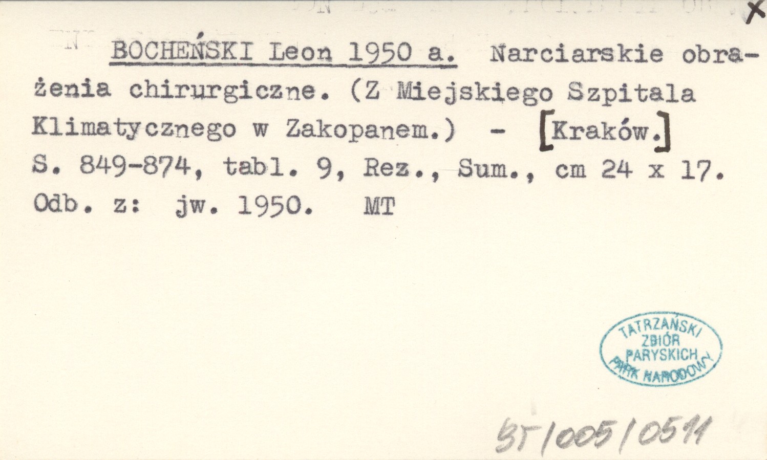BOCHEŃSKI Leon 1950 a Narciarskie obrażenia chirurgiczne. (Z Miejskiego Szpitala Klimatycznego w Zakopanem.).