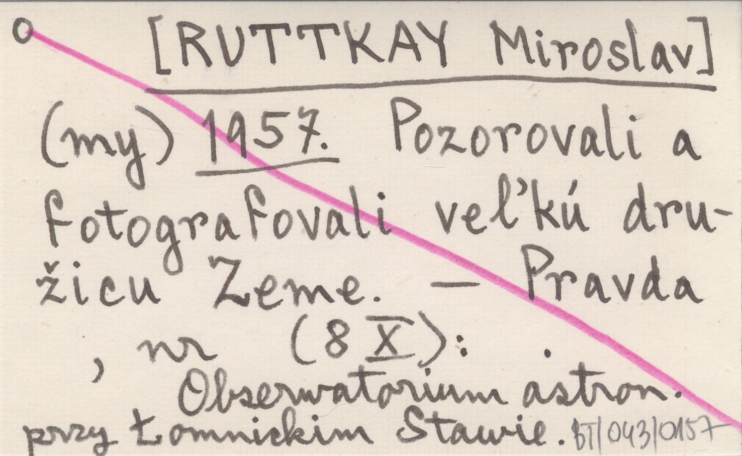 (my) [RUTTKAY Miroslav] 1957 Pozorovali a fotografovali veľkú družicu Zeme.