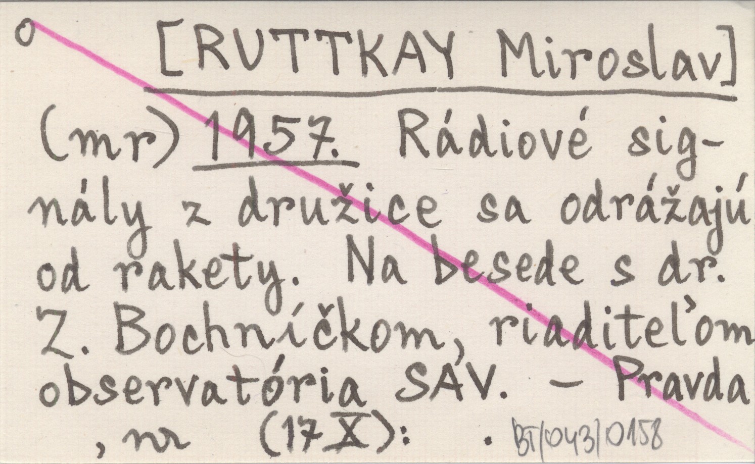 (mr) [RUTTKAY Miroslav] 1957 Rádiové signály z družice sa odrážajú od rakety. Na besede s dr. Z. Bochníčkom, riaditeľom observatória SAV.
