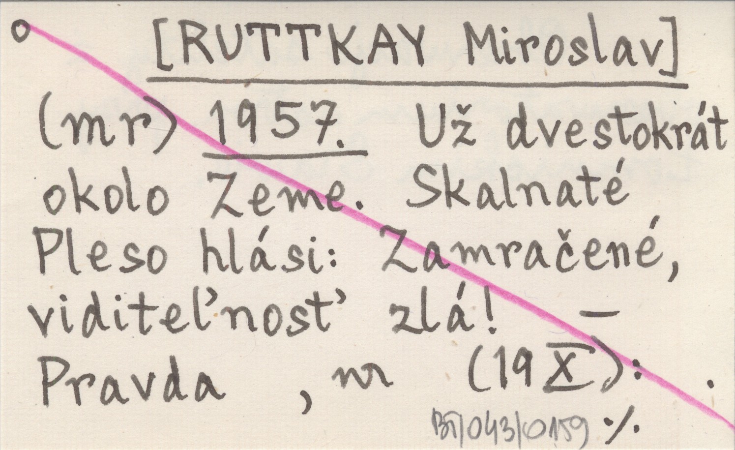 (mr) [RUTTKAY Miroslav] 1957 Už dvestokrát okolo Zeme. Skalnaté Pleso hlási: Zamračené, viditeľnosť zlá!