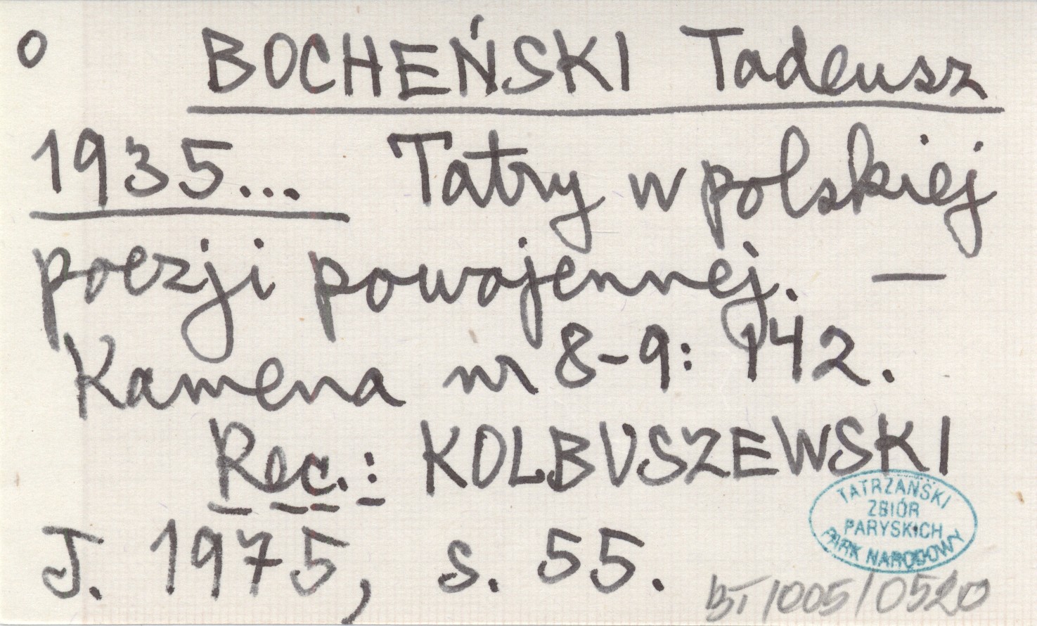 BOCHEŃSKI Tadeusz 1935... Tatry w polskiej poezji powojennej.