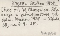 RYGIEL Stefan 1938 W. Olszewicz: Słowacja w piśmiennictwie polskim. Kraków 1937.