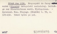 RYMAR Jan 1936 Przyczynki do fauny ważek (Odonata) Małopolski zachodniej. Beiträge zur Odonatenfauna westl. Kleinpolens.