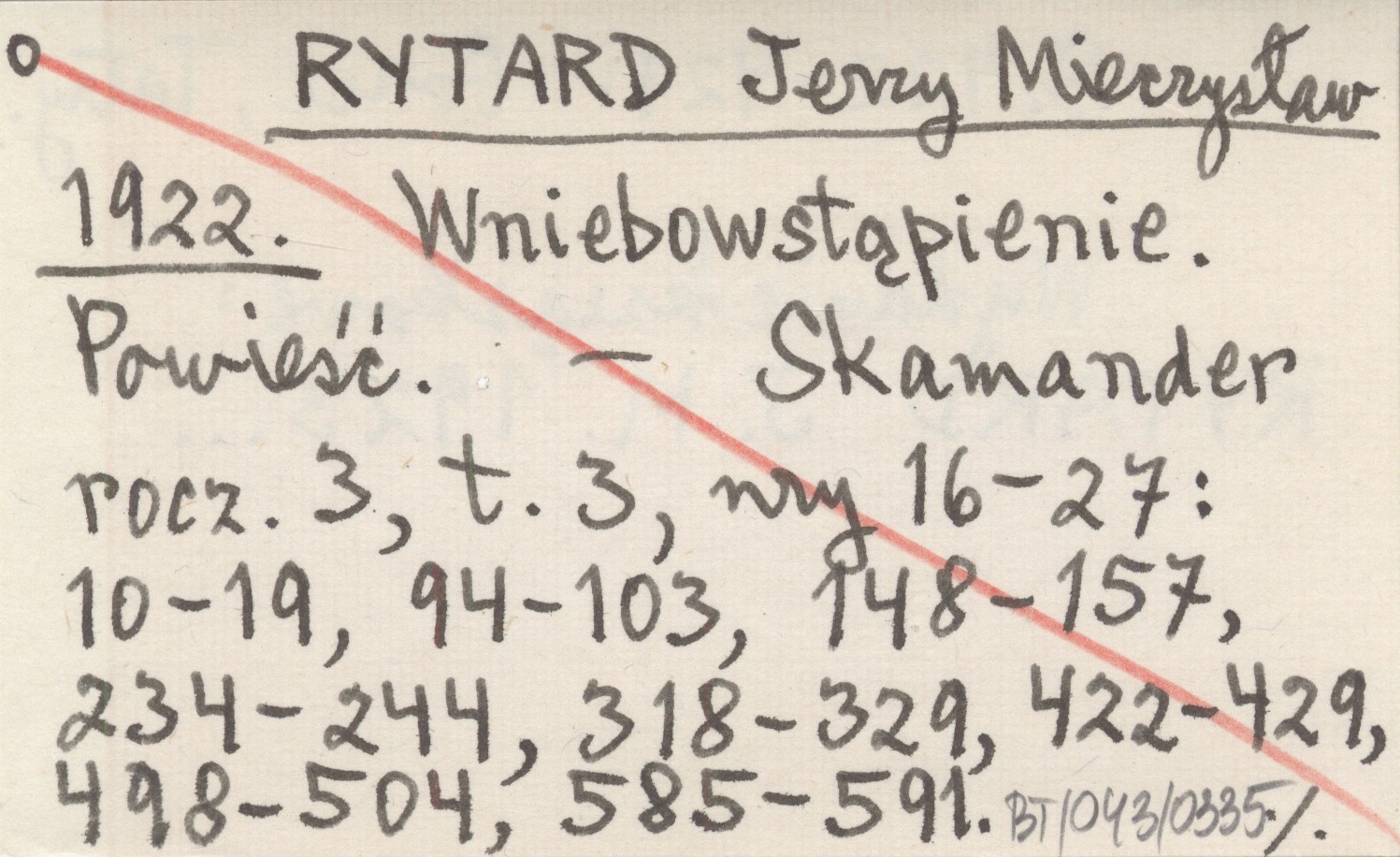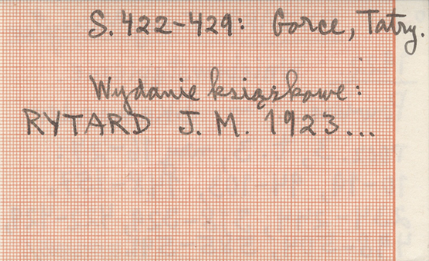 Skamander, R. 3, t. 3, nr 16-27: 10-19, 94-103, 148-157, 234-244, 318-329, 422-429, 498-504, 585-591. S. 422-429: Gorce, Tatry. Wydanie książkowe: RYTARD J. M. 1923...