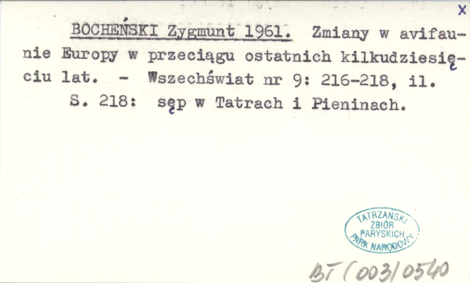 BOCHEŃSKI Zygmunt 1961 Zmiany w avifaunie Europy w przeciągu ostatnich kilkudziesięciu lat.